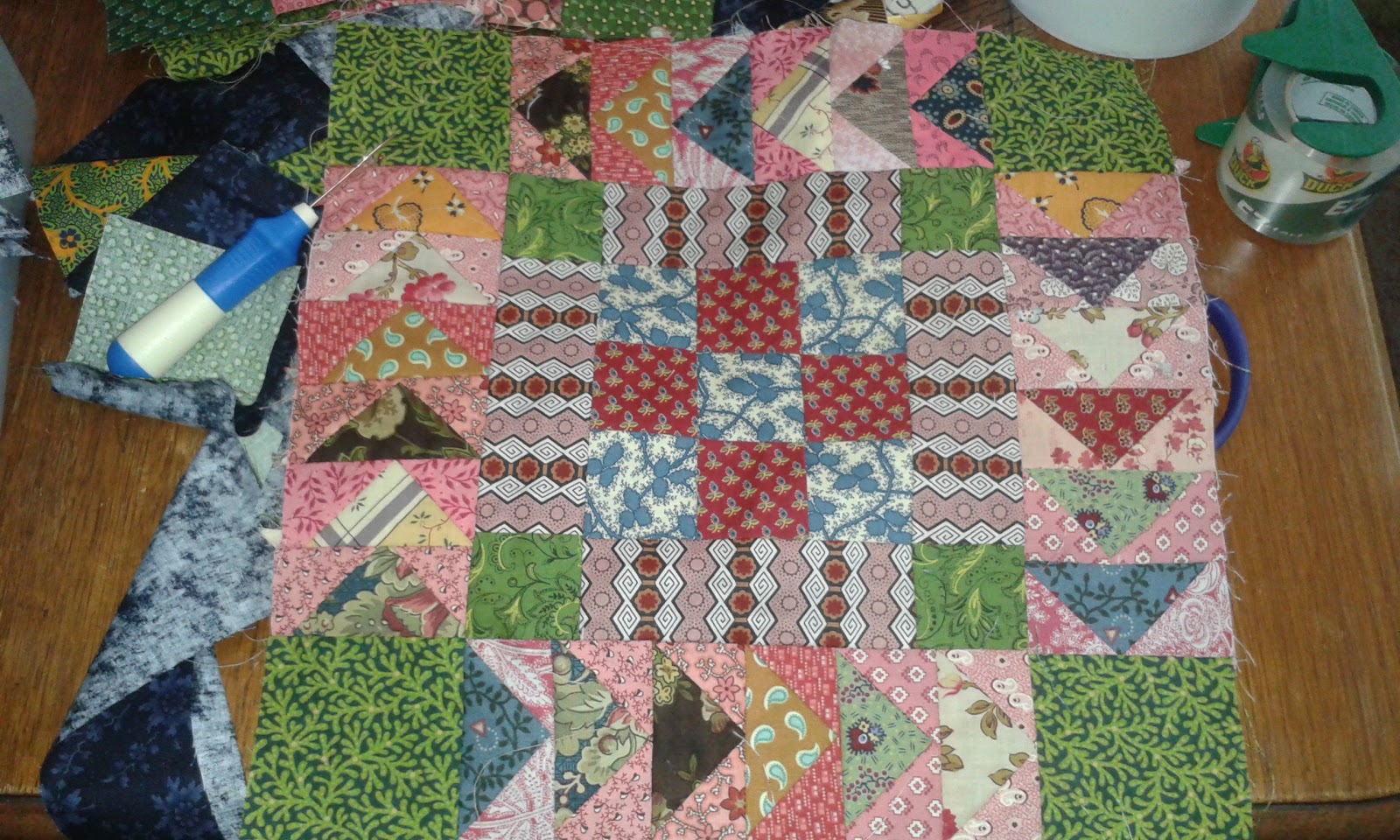 Finally, all the blocks are assembled, with the sashing. Time to get those 4 patch blocks out and see what I can do with the borders.